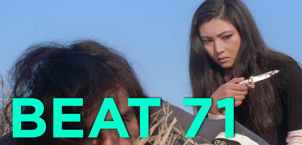 After getting framed for a murder her boyfriend Ryumei committed, Furiko finds herself incarcerated in the Women’s Remand Center. Two months later, she and her chosen sister Ayako escape. While Ayako heads to Shinjuku to rally Furiko’s crew, Furiko returns to her hometown to find Ryumei and confront him. Things get complicated when Furiko and her gang learn Ryumei is poised to inherit his family’s business empire, while his father (who framed Furiko for the murder) is running for mayor: his campaign would be wrecked by a murder scandal, so he kidnaps Furiko and holds her hostage in his mansion. As Furiko’s freewheeling crew schemes to rescue her, they become entangled in a web of political intrigue and corrupt cops. Much lighter fare than the rest of the STRAY CAT ROCK series, BEAT ’71 builds to an explosive climax at an abandoned mine transformed into a fake Western film set just outside of town where hippies, a biker gang, and chimpanzees face off amidst gunfights and dynamite.